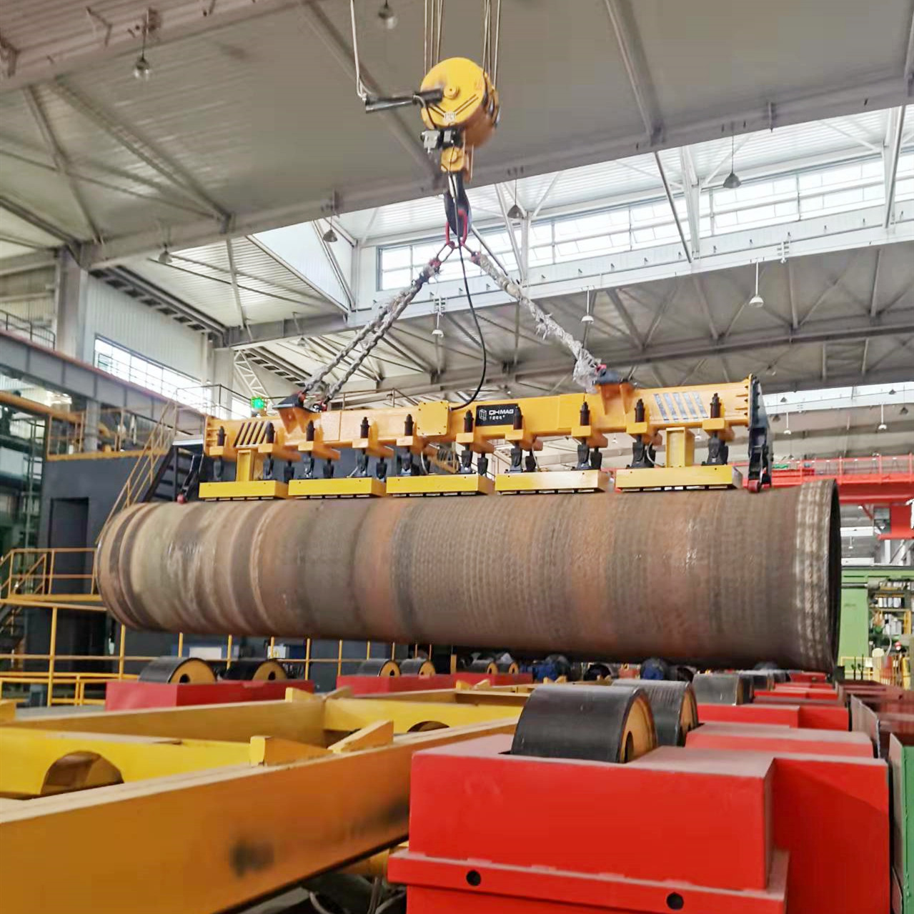 千豪電永磁吊具在吊鋼板,鋼管,鑄管等導磁工件上取得廣大顧客的認可與返購。使用電永磁吊具吊裝鋼管及鑄管圓形導磁工件,只需要吸附一部分接觸面即可吸吊起8噸、10噸、16噸,32噸.
