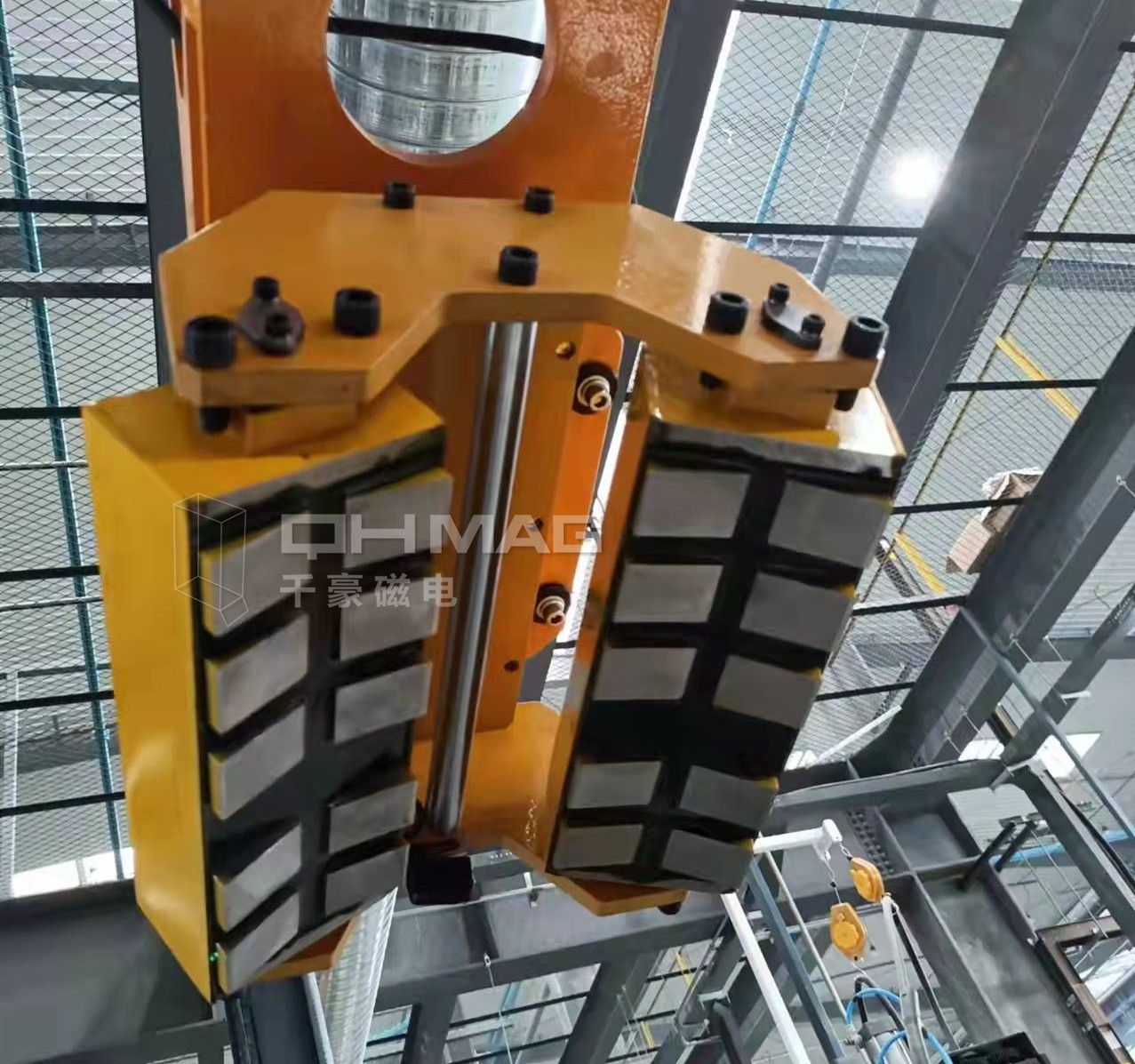 湖南千豪按照客戶需求定制的這款自動化機械手吸盤采用雙面磁極分布,兩面都設計成V型,磁極分布均勻,吸力可達到最高80L熱水器內膽的需求。磁力可調節,吸附50L到80L熱水器內膽皆可。采用電永磁吸附的最大好處便是不會損壞內膽表面,保持產品完整美觀。吸附大大小小的內膽無需更換夾具,更加適用于不同重量要求。